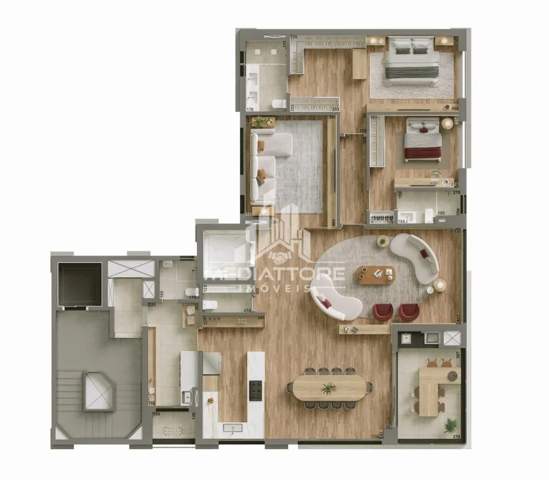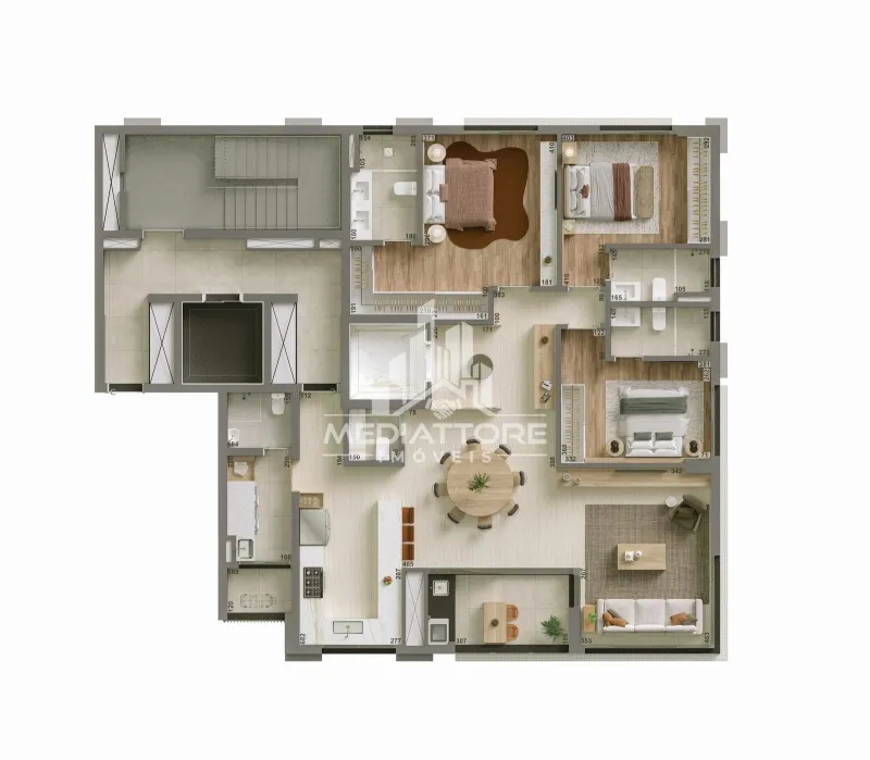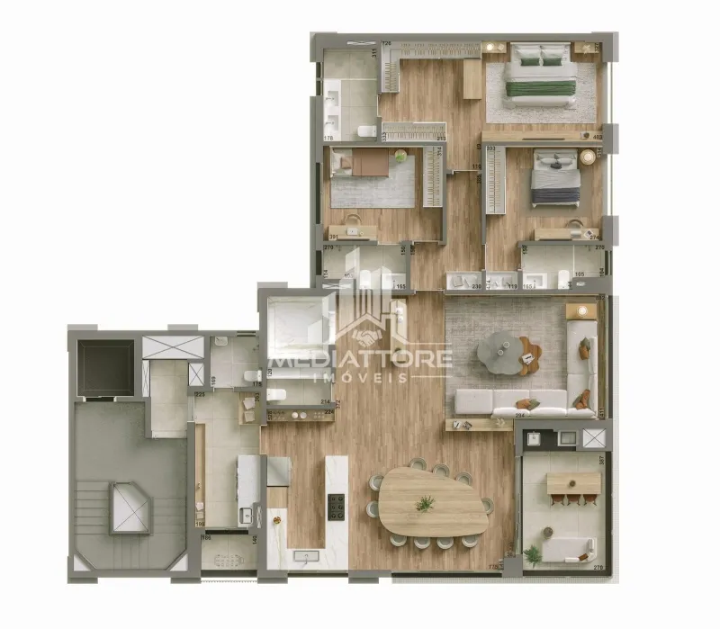 Os diferenciais revelam o cuidado em cada detalhe: acabamento em gesso, cozinha planejada para funcionalidade e sofisticação, piso aquecido nos banheiros, elevando o conforto térmico, e fechadura eletrônica com senha, que alia segurança e tecnologia ao dia a dia.