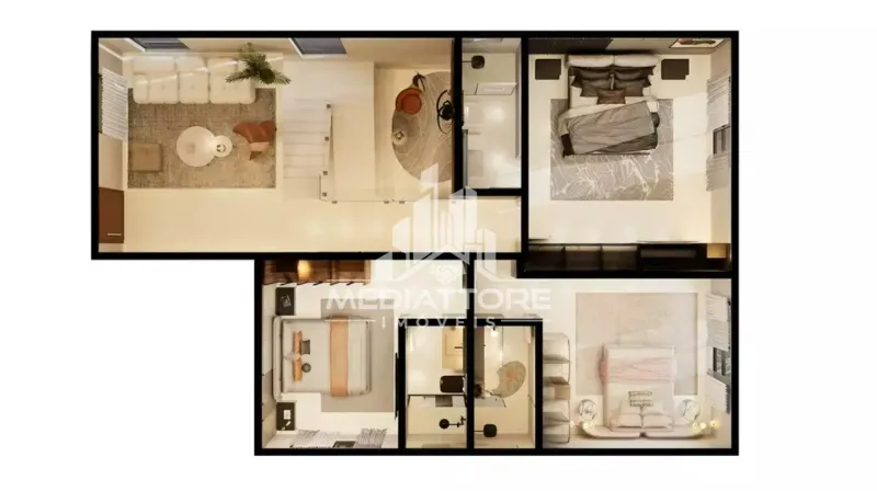 ✔️ 3 suítes amplas, todas com persianas automatizadas, garantindo conforto e privacidade